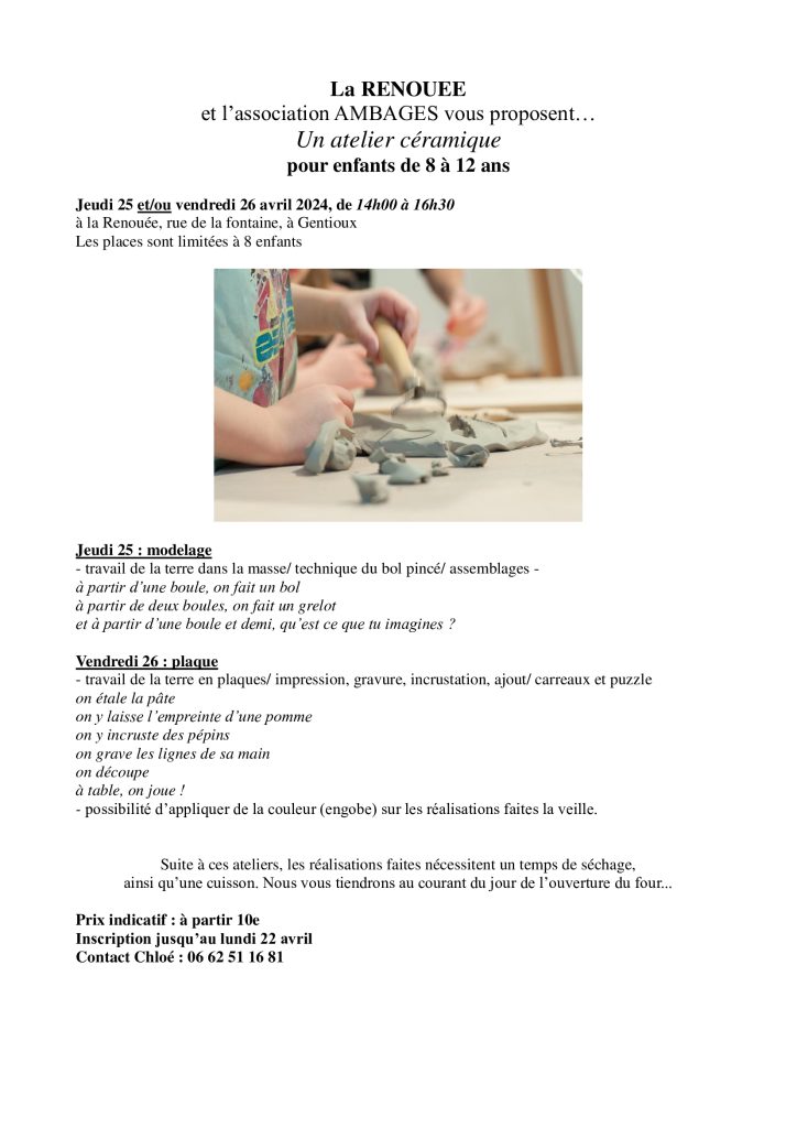 Un atelier céramique pour enfants de 8 à 12 ans Jeudi 25 et/ou vendredi 26 avril 2024, de 14h00 à 16h30 à la Renouée, rue de la fontaine, à Gentioux