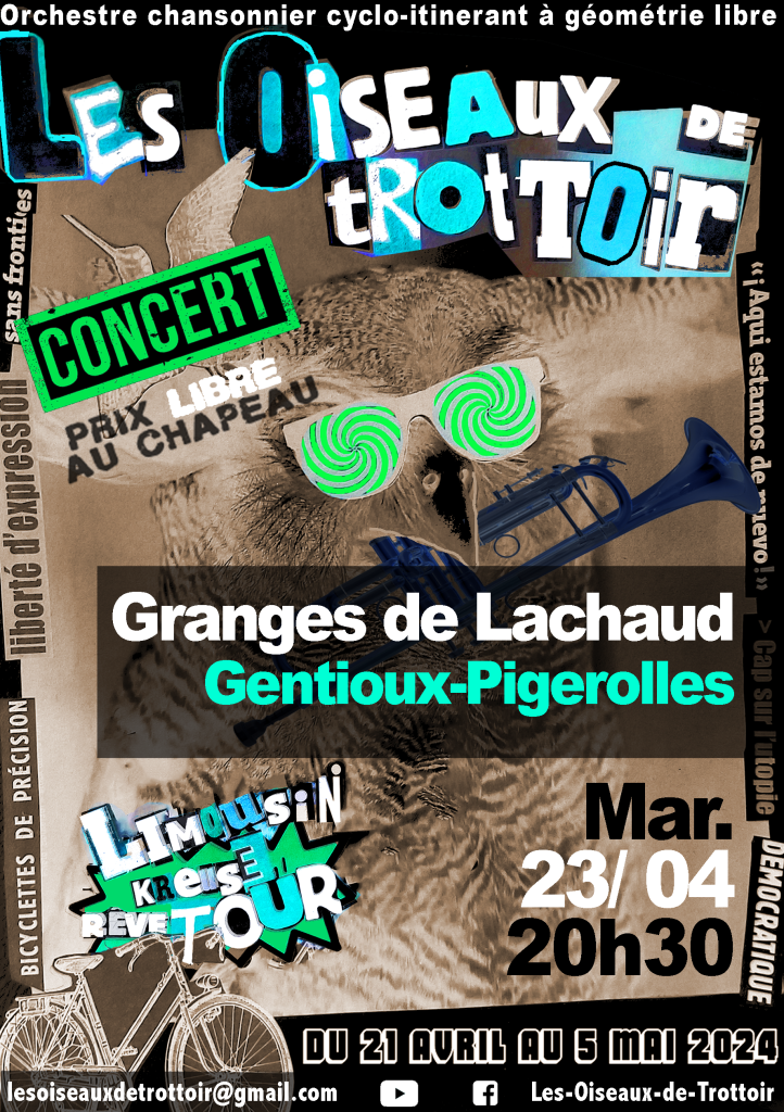 Avec le printemps les oiseaux migrent de nouveau et La Bascule est contente d’accueillir Les oiseaux de trottoirs. Et comme ils sont nombreux, le concert aura lieu aux Granges de Lachaud le mardi 25 avril à 20h30.
