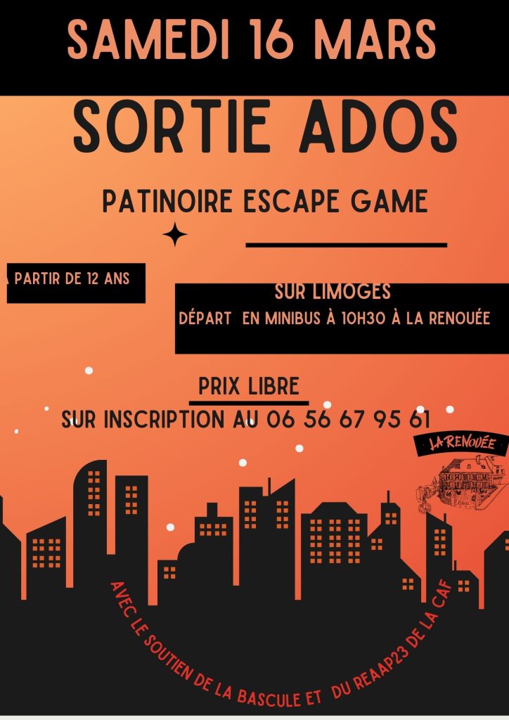L’association La Bascule, avec le soutien de la CAF de la Creuse (dans le cadre du financement REAAP 23 ) organise plusieurs sorties à l’intention des adolescents et nous proposons notre deuxième sortie le 16 mars, à Limoges avec patinoire (qui était fermée la fois dernière, remplacée par le trampoline) et