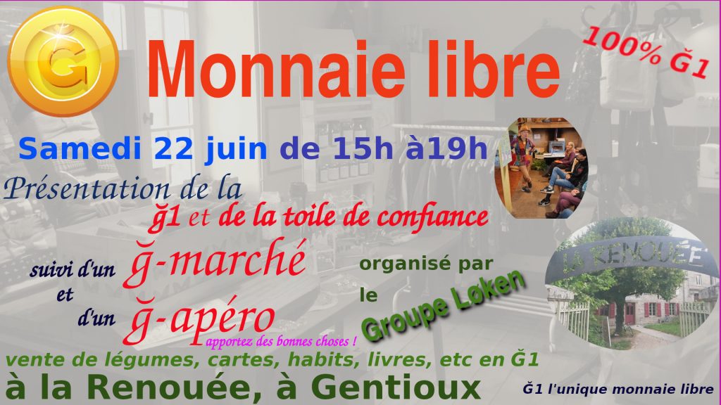 Ensuite, à 16h30 commencera le ğ-marché organisé par le groupe Løken. Vous pourrez, si cela vous intéresse, faire vos premiers achats en junes et ouvrir un compte avec l’application Césium.
