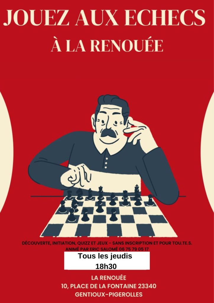 Les soirées d’échec reprennent avec la rentrée! Jouez aux échecs / Chess play « Découverte, Initiation, Quizz et Jeux à la Renouée, tous les jeudis soir. Sans inscription et pour tou.te.s.