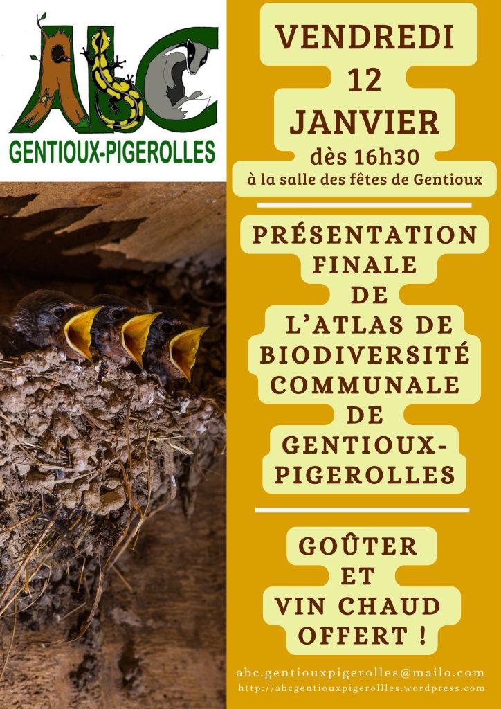 Nous organisons la présentation finale du projet d’Atlas de Biodiversité Communale de Gentioux-Pigerolles le vendredi 12 janvier à partir de 16h30 à la salle des fêtes de Gentioux.