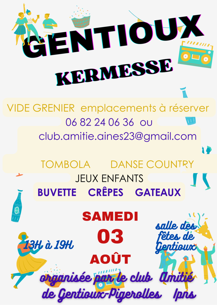 Samedi 3 août Kermesse Vide grenier à Gentioux Veuillez laisser ce champ vide Suivez l'agenda et les actualités de l'association Nous vous enverrons entre 1 et 5 messages par mois et n'utiliserons votre adresse que pour celà. Vous pourrez vous désinscrire à tout moment. Vérifiez votre boîte de réception ou votre dossier d’indésirables pour confirmer votre abonnement !